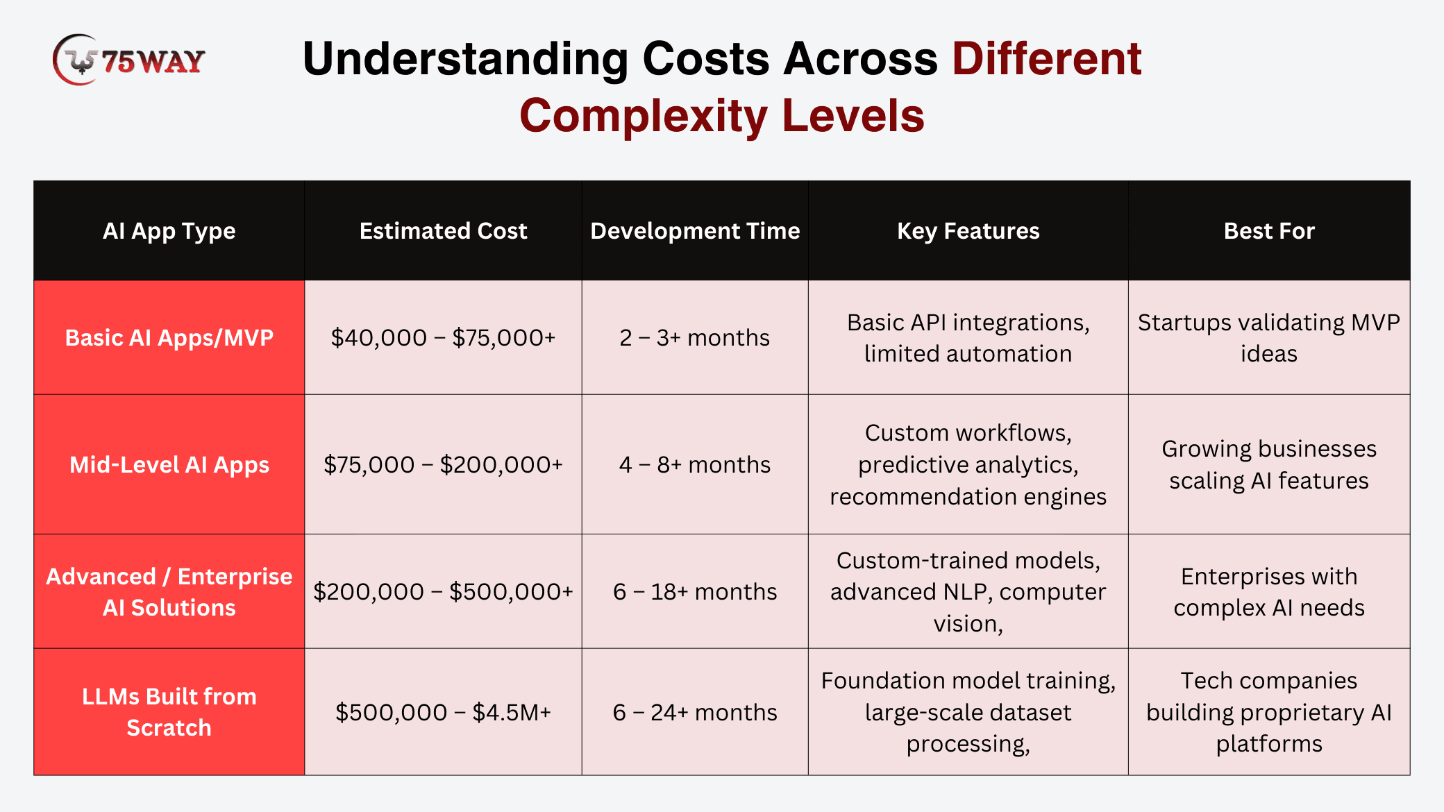 - AI development costs range from $40,000 to $4.5M+ in 2026.