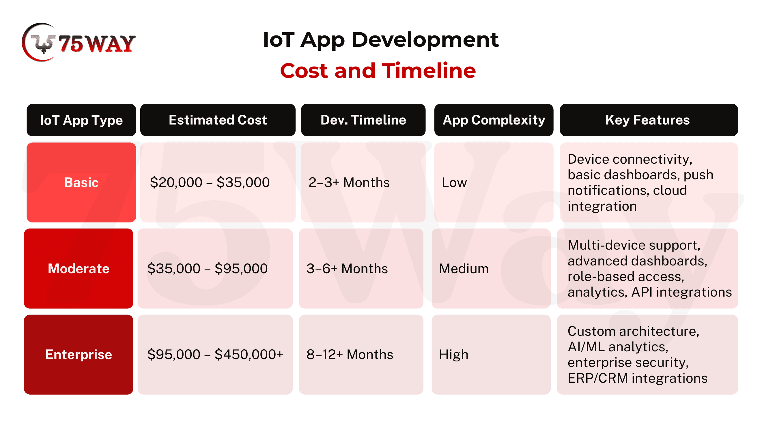 The process to develop an IoT app requires careful planning and investment, as costs and timelines vary depending on complexity, features, and intended scale. Basic apps with simple devices may consume $20-35K and be developed within 2-3 months. On the other hand, enterprise-level solutions demand longer development cycles of 8-12+ months with advanced functionality and require $95,000 – $450,000+.