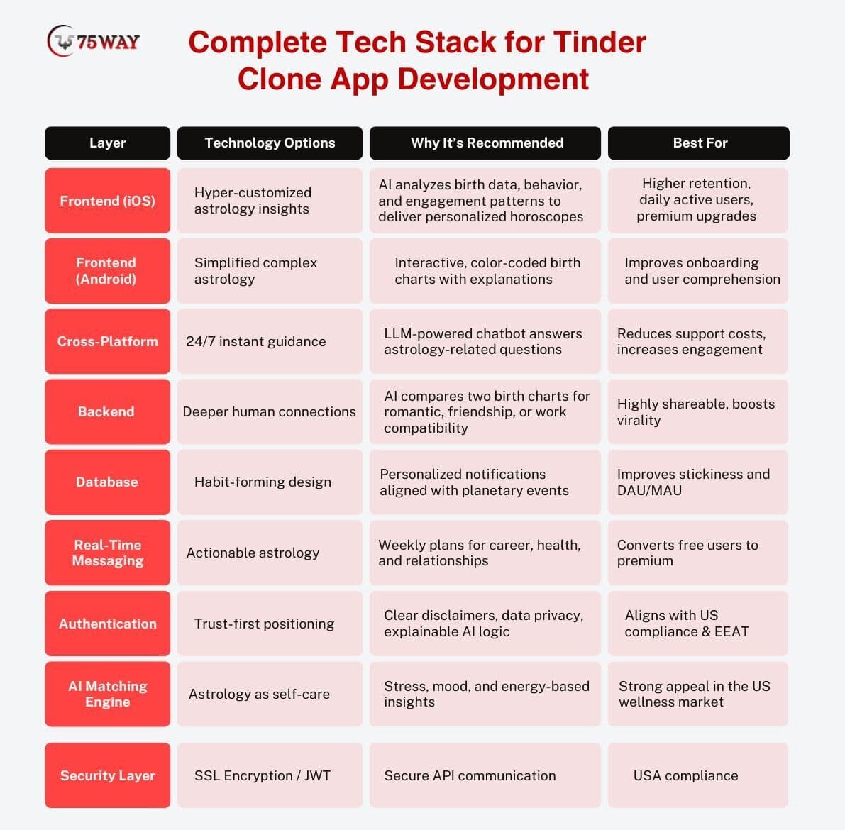 Once the design is completed for Tinder clone script, the next stage is to decide the technology choice made at the beginning influence app speed, long-term costs, and future expansion. A strong technical base supports growth across multiple states in the USA without frequent rebuilds. For startups aiming at serious traction, the right stack supports performance, security, and steady feature expansion from day one.