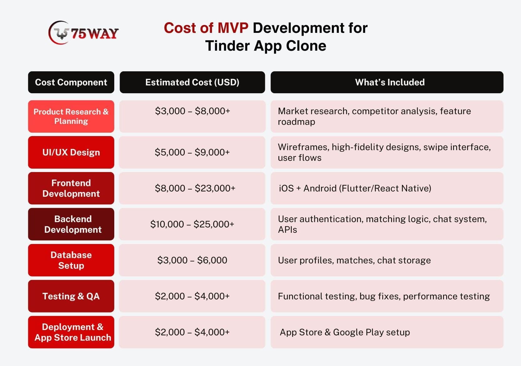 Tinder clone app development cost depends on feature depth, technology choices, and business goals in the USA market. A basic MVP typically ranges from $10,000 to $40,000+, with a development timeline of about 2-3 months. This level suits founders validating an idea, testing user response, and preparing for early investor discussions without heavy upfront spending.