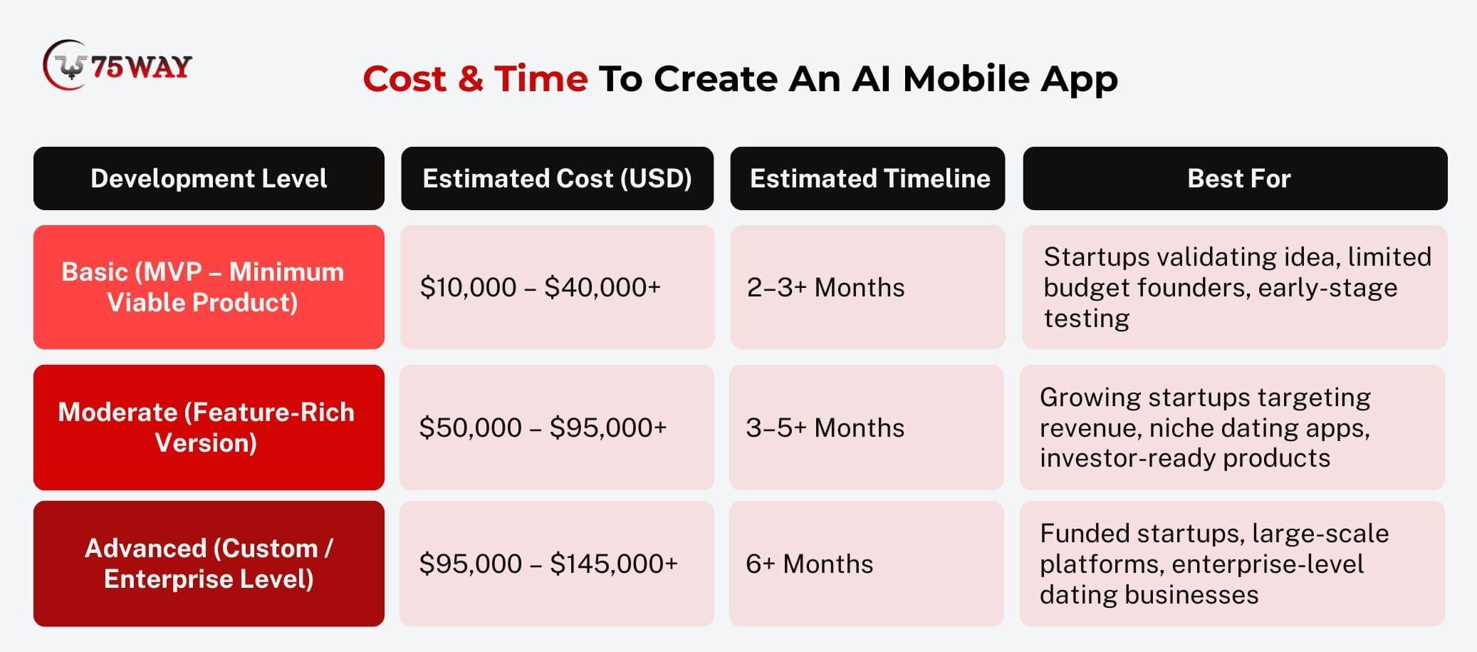 A moderate feature-rich version of Tinder app clone typically costs between $50,000 and $95,000+ and requires 3-5 months of development. This stage fits revenue-focused startups ready to compete in niche dating markets. An advanced or enterprise-level platform ranges from $95,000 to $145,000+, with 6 months or more of development, as it requires large user bases, AI-powered matchmaking, and high-concurrency infrastructure.