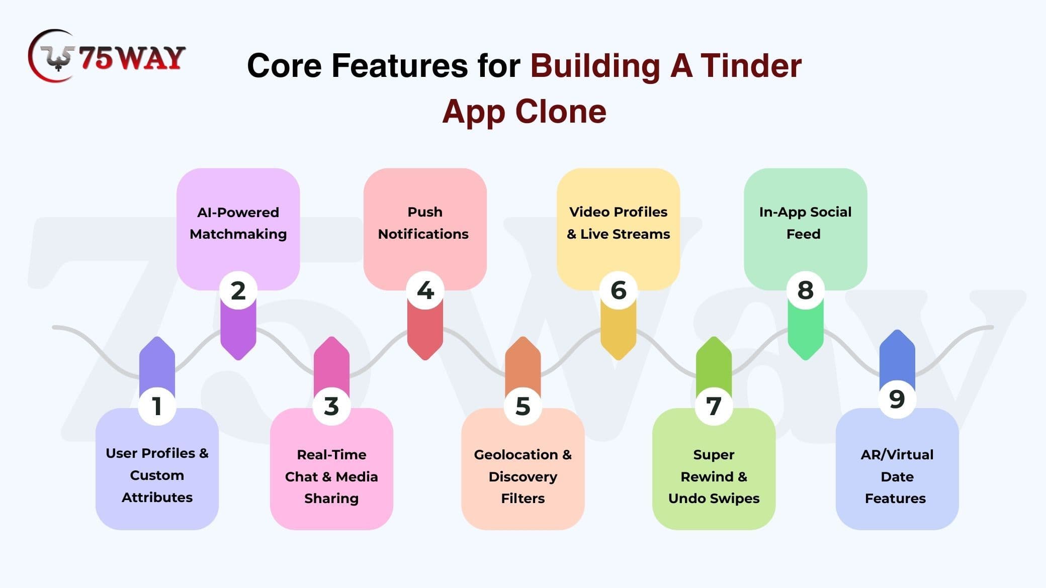 The first version of a Tinder clone app does not need advanced AI or live streaming. Strong foundations matter more than feature volume. You can add user registration to open the journey, swipe functionality to create engagement, and match confirmation for emotional reward. Basic chat allows connection, and push notifications bring users back into the app. Revenue validation from the beginning shows investors that the model works within the USA subscription economy.