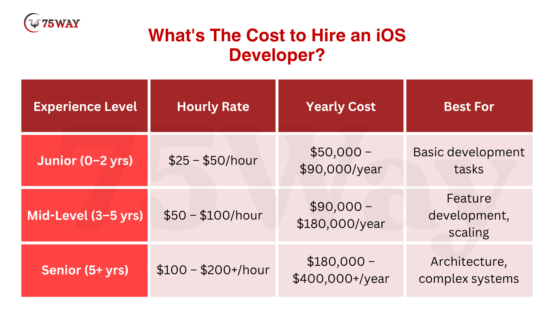 - Junior iOS Developer Cost: $25 – $50/hour