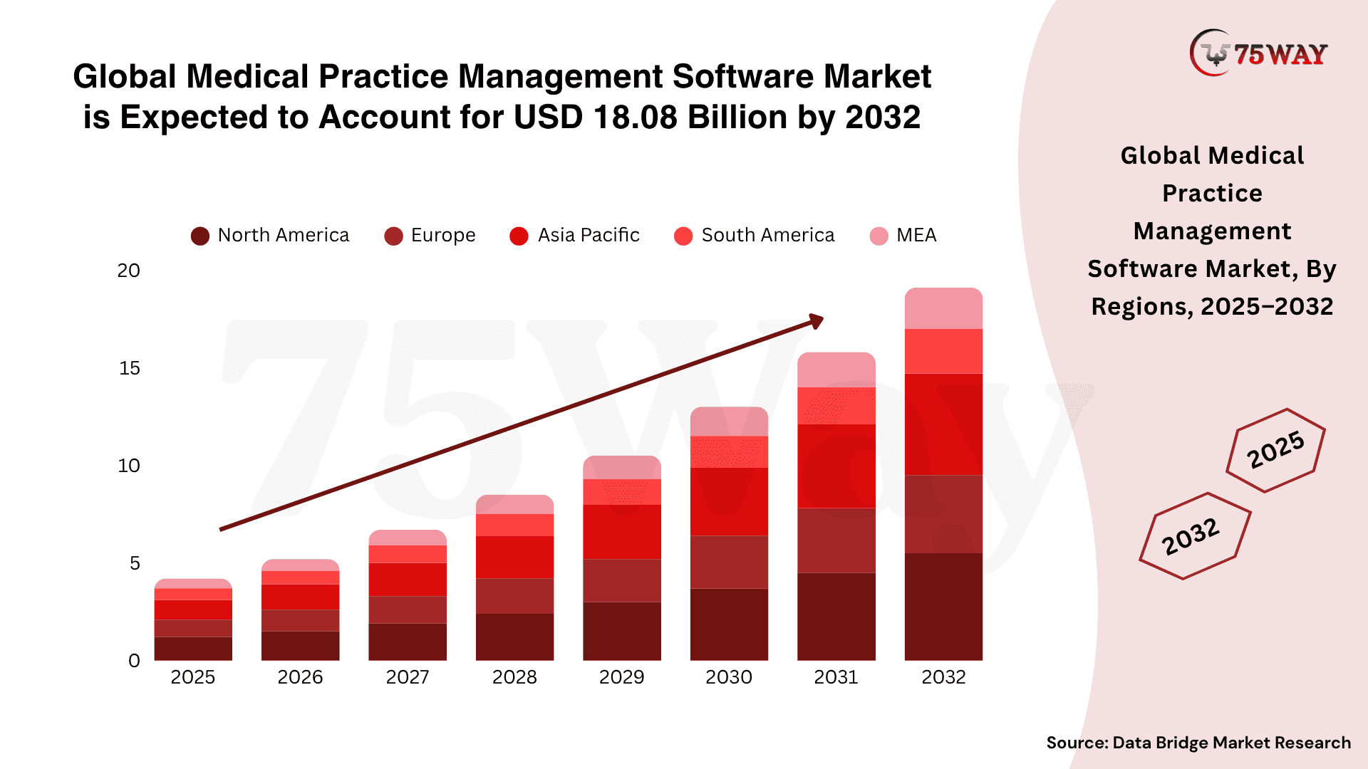 - The global medical practice management software market is projected to reach $18.08 billion by 2032, growing at a CAGR of 9.30%.