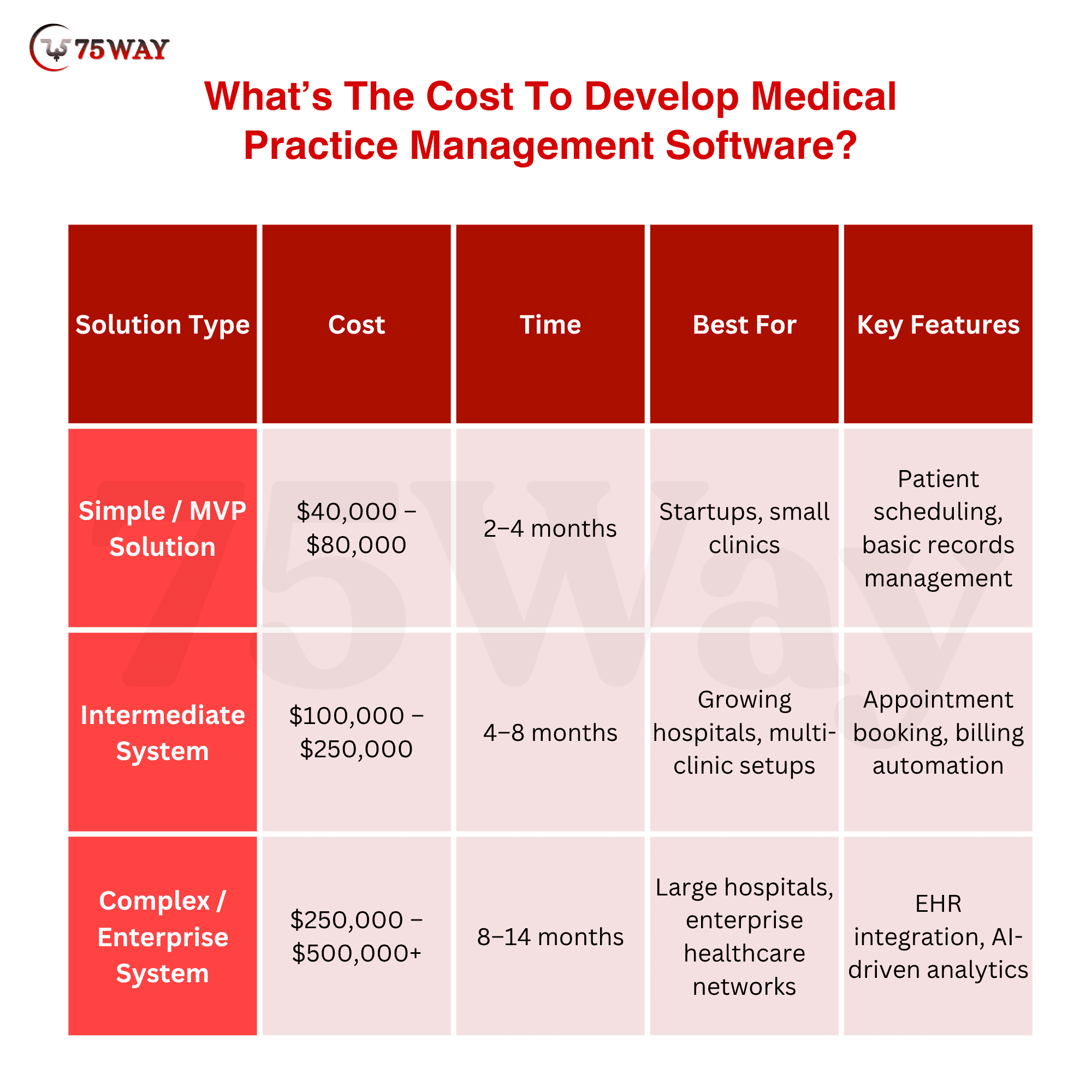 The cost of medical practice management software development depends on features, complexity, integrations, compliance requirements, and scalability needs. On average, development costs range from $40,000 to $500,000+, depending on scope, technology stack, and level of customization. Basic systems with core modules such as scheduling, billing, and patient records cost less, while advanced platforms with AI, automation, and enterprise-grade security require a higher investment.
