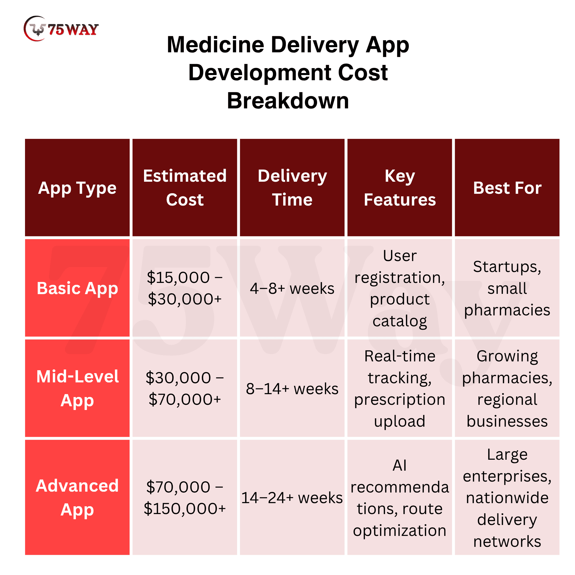 The development of a medicine delivery app varies based on the level of features and complexity. On average, the cost typically ranges from $15,000 – $300,000+, depending on whether the app is basic, mid-level, or advanced with AI-driven and scalable enterprise-grade features.