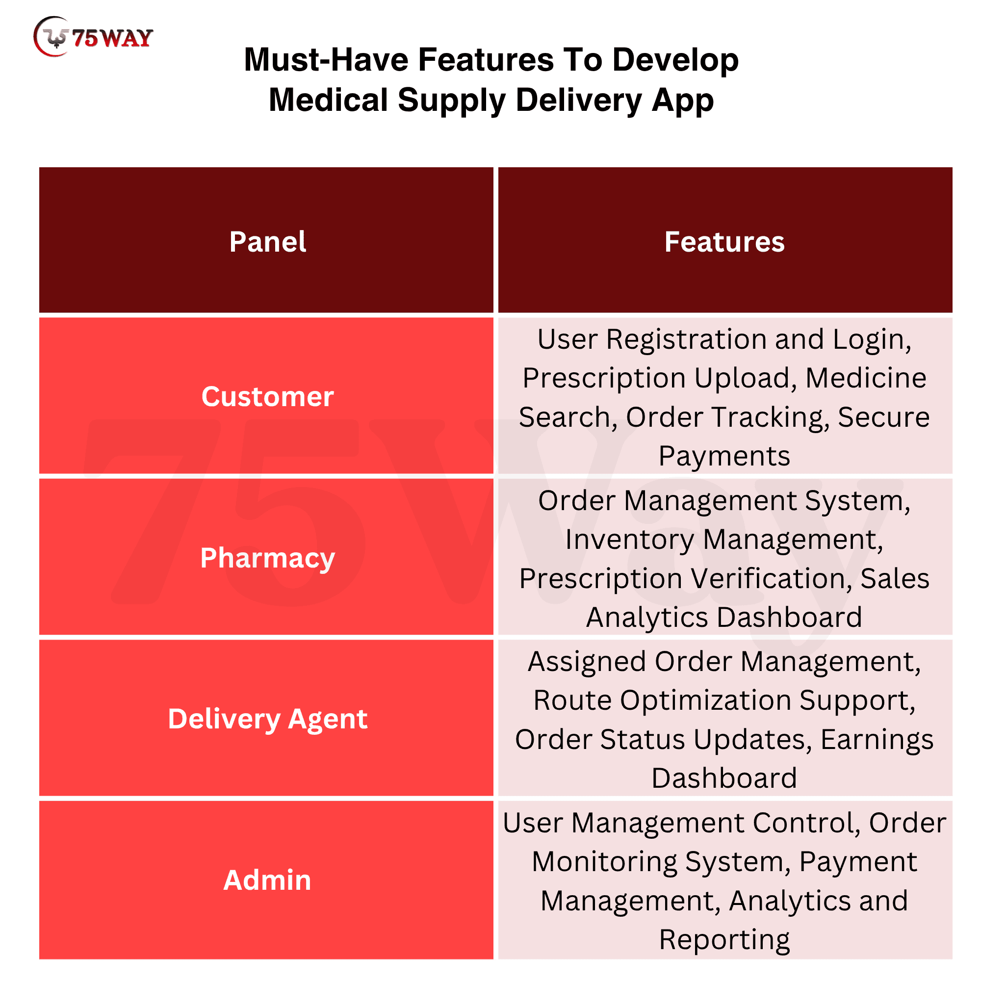 A seamless and reliable medical supply delivery application depends on a well-structured set of features designed for customers, pharmacists, and administrators. These features play a crucial role in enabling smooth order placement, secure prescription management, real-time tracking, and efficient backend coordination across the entire system.