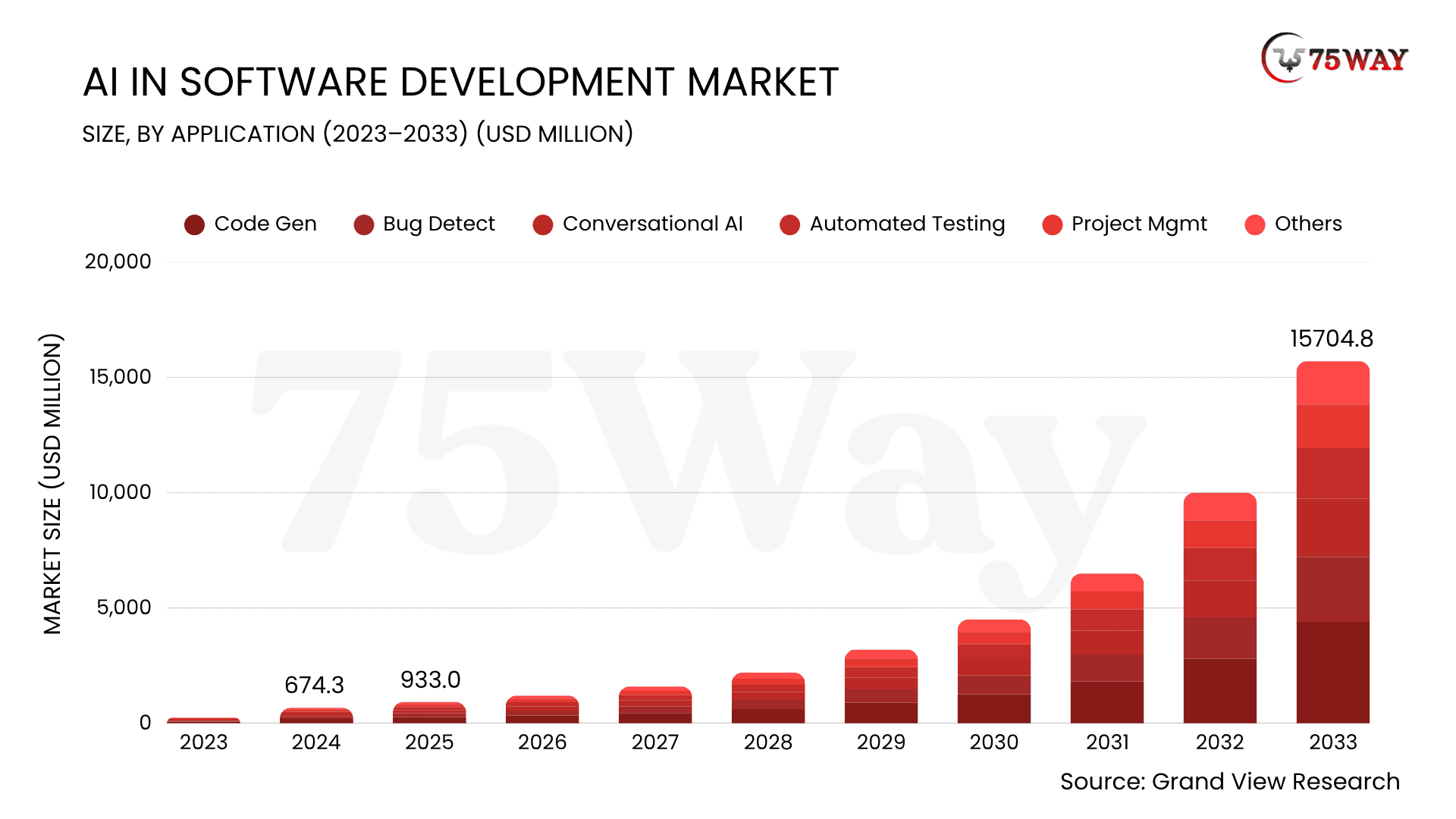Not only you, but several business owners or startups, now want to launch AI-powered software. Whether they are from healthcare, ecommerce, retail, automotive, logistics, education, IT, or finance. The demand for intelligent systems has surged as businesses race to automate operations, personalize customer experiences, and improve decision-making speed. Even the global AI in software development market is projected to reach approximately $15,704.8 million by 2033, expanding at a strong CAGR of 42.3%, showing how rapidly this space is evolving.