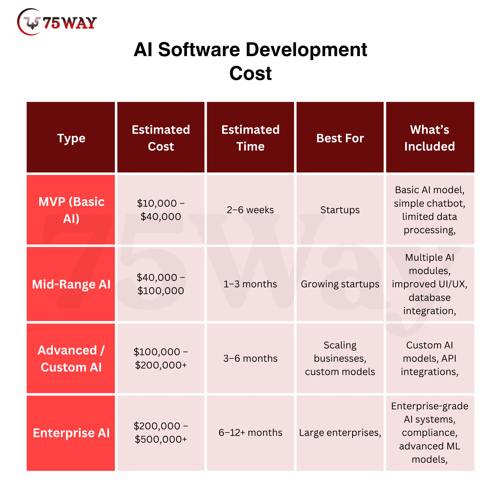 - AI software development cost ranges between $10,000 and $500,000+ based on complexity