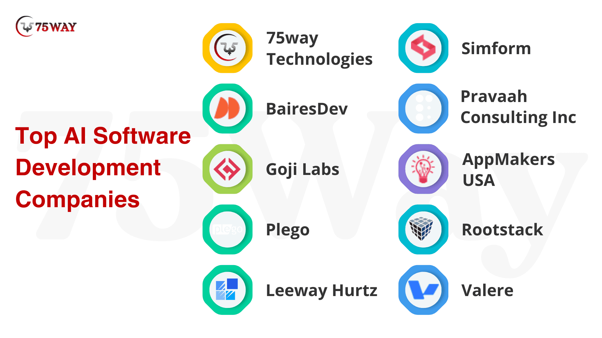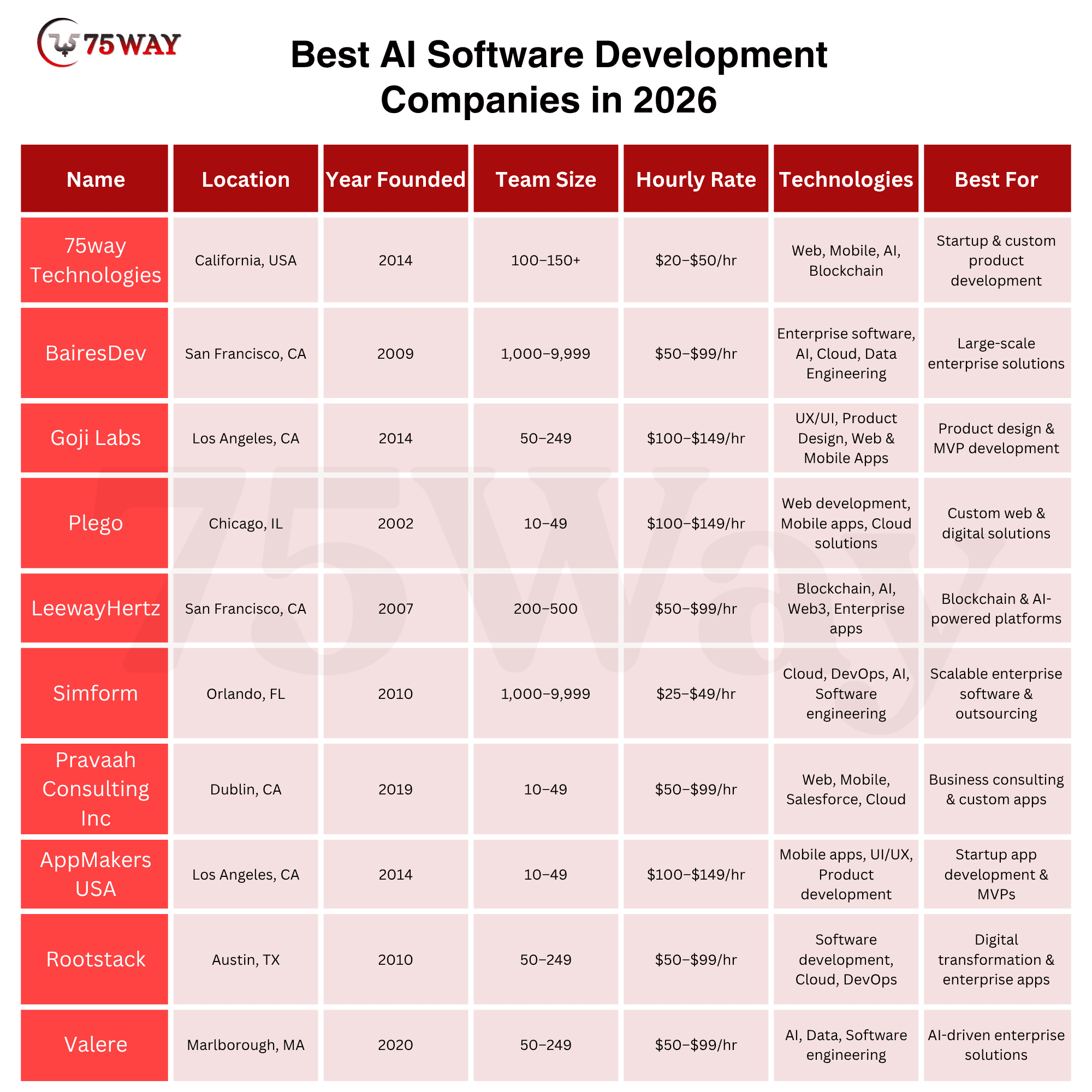 Choosing the right AI software development company determines whether your idea becomes a scalable product or a missed opportunity. This comprehensive overview highlights leading AI-powered software development companies like 75way Technologies, BairesDev, Goji Labs, and Simform, along with hiring strategies, cost insights, and key success factors to help businesses build high-performing, future-ready AI solutions that drive measurable growth.