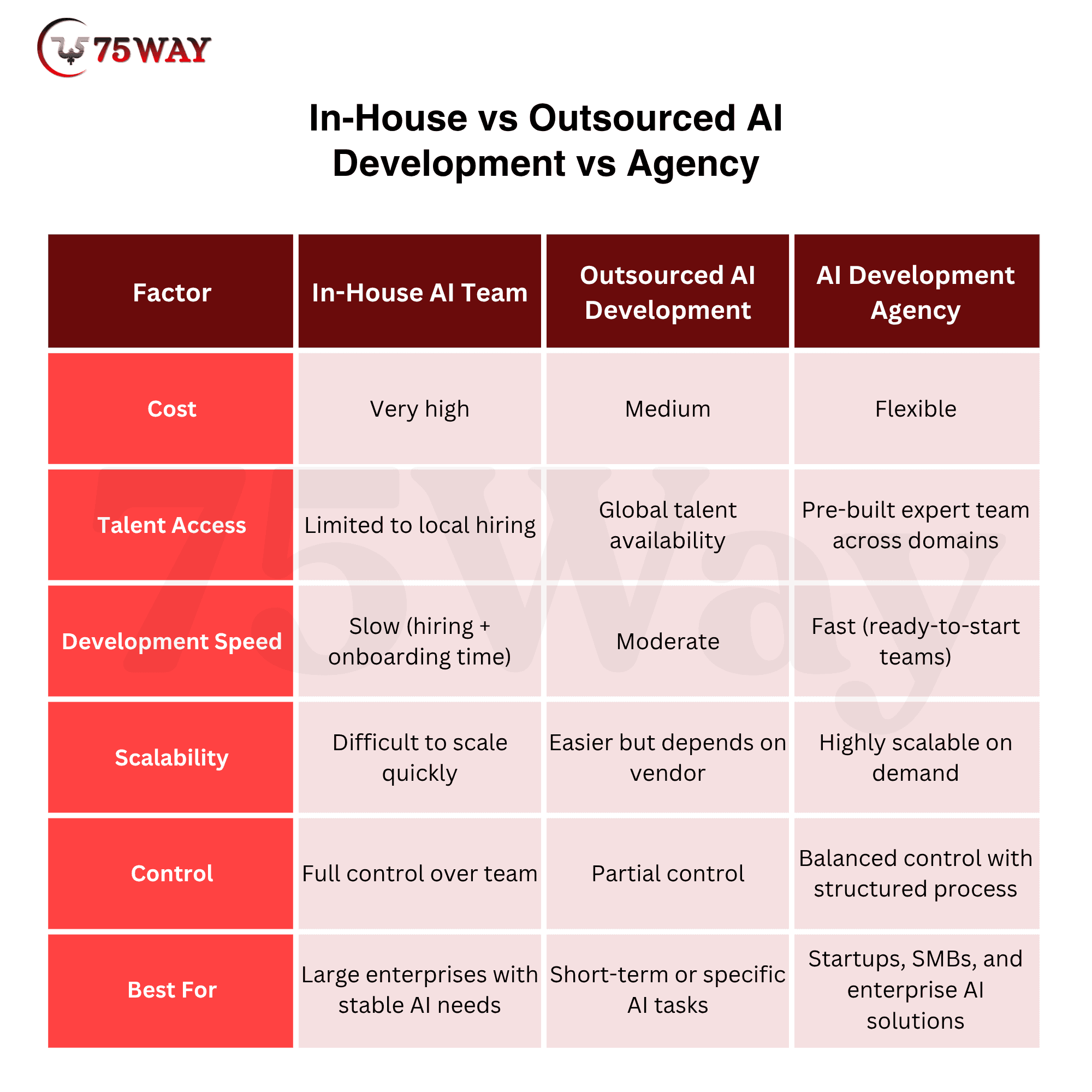 The best choice between in-house, outsourced, and agency-based AI development depends on your budget, project complexity, and scalability needs. Enterprises prefer in-house control, while startups and growing businesses often benefit more from outsourced teams or specialized AI agencies.