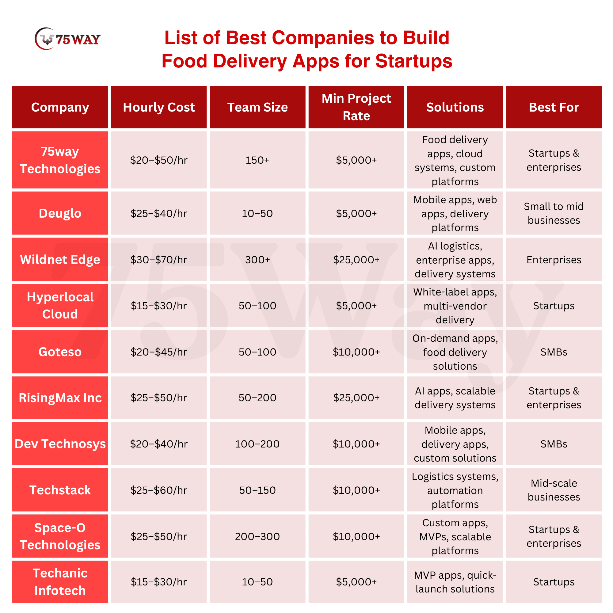 A well-established development company focused on building scalable food delivery applications with modern technologies and cloud-based infrastructure. 75way supports businesses with end-to-end development, from design to deployment. The company is suitable for startups and enterprises seeking reliable, high-performance delivery platforms.