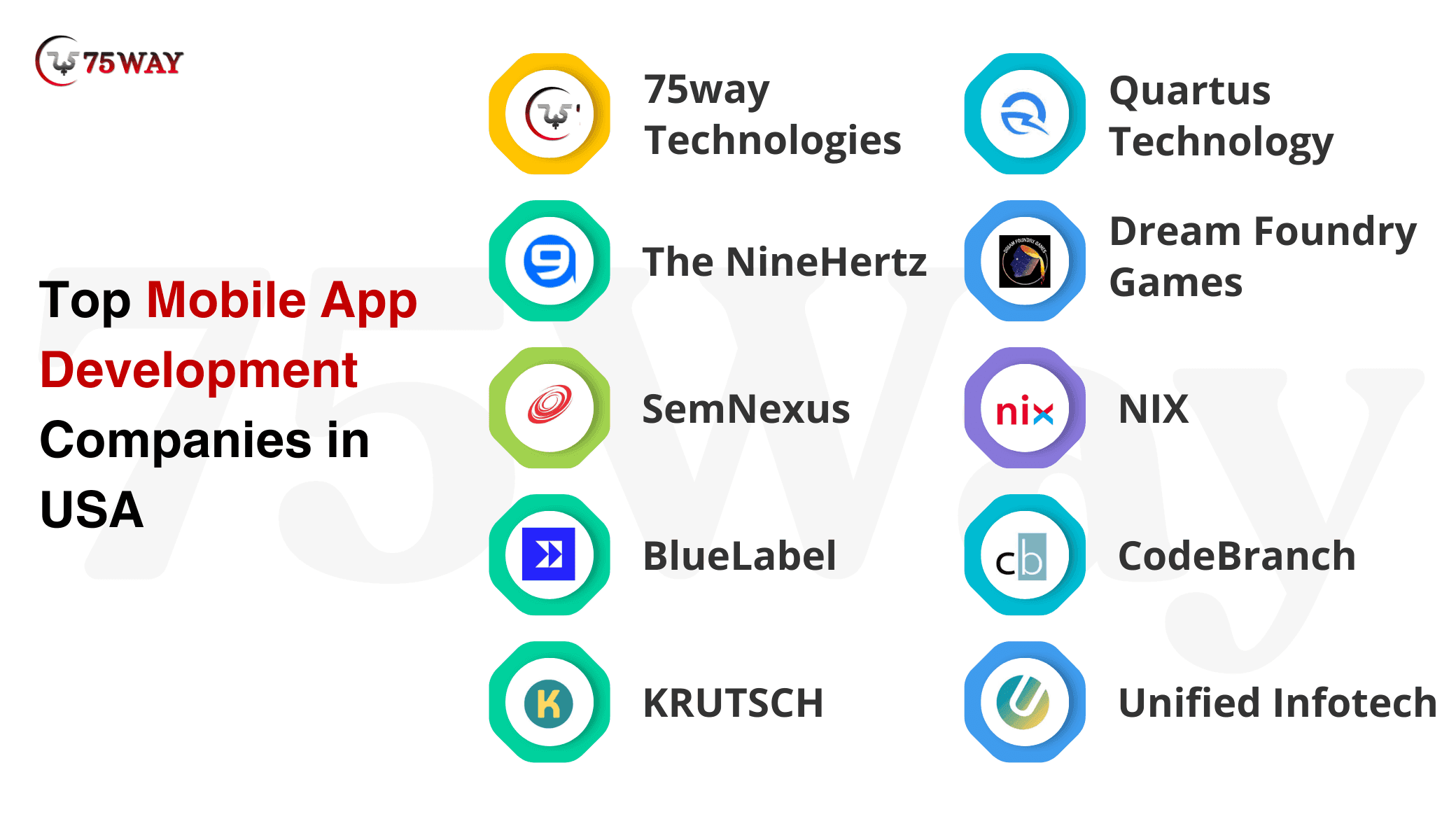 Some of the most trusted companies in the US include 75way Technologies, The NineHertz, BlueLabel Labs, KRUTSCH, NIX, and Unified Infotech. These companies are recognized for delivering high-quality apps across industries, offering expertise in iOS, Android, cross-platform development, and emerging technologies like AI, IoT, and AR/VR.