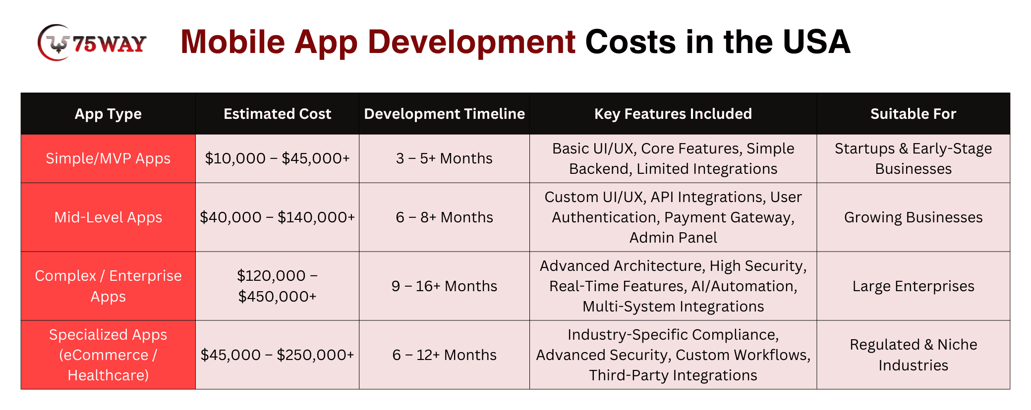 Simple/MVP App Cost: The cost to create a simple or MVP (Minimum Viable Product) app in the USA typically ranges from $10,000 to $45,000, with a timeline of 3–5 months. These apps focus on core functionality, basic UI/UX, and essential backend features, making them ideal for startups testing ideas or entering the market quickly without a large upfront investment.