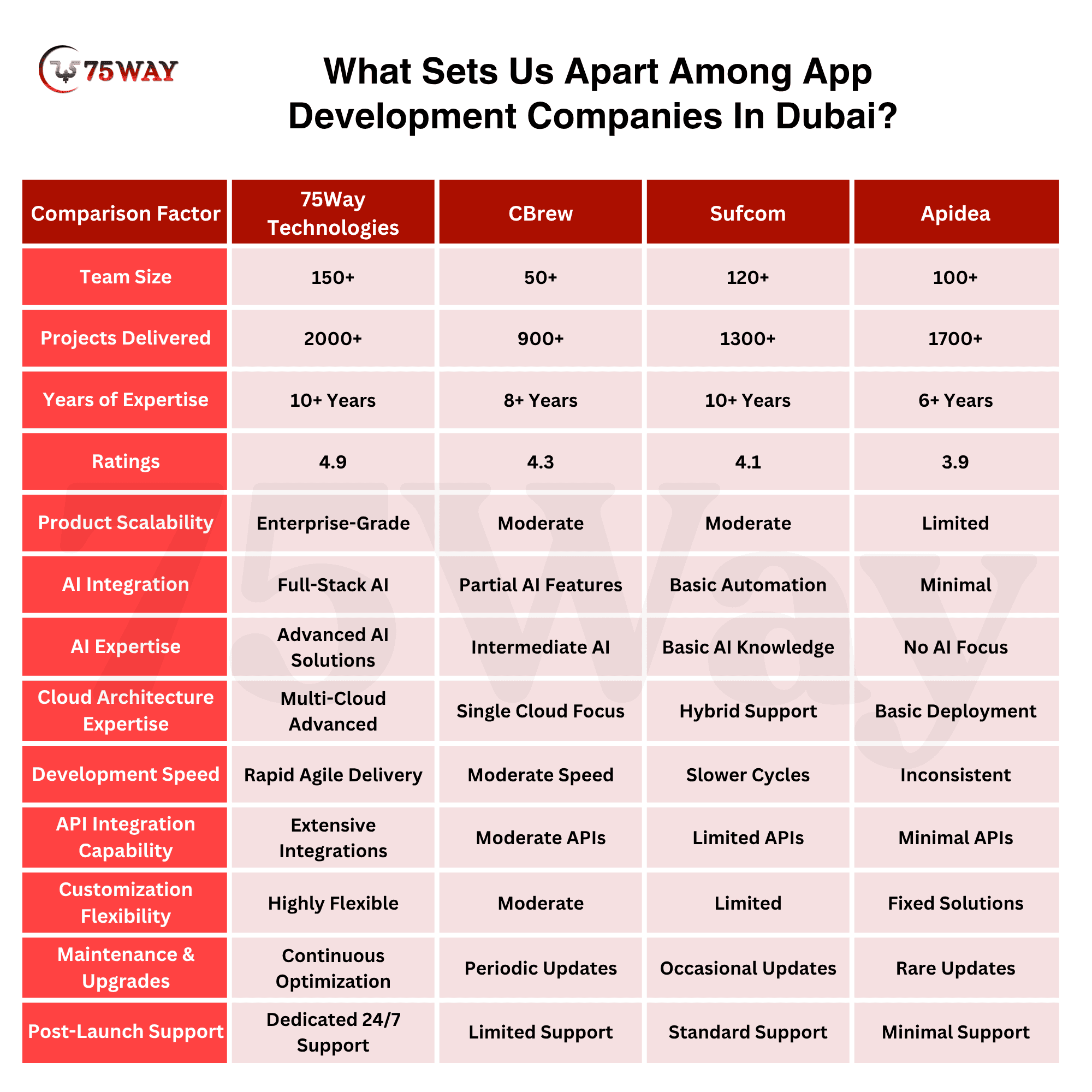 75way Technologies is recognized as one of the top mobile app development companies in Dubai. We combine expert developers, designers, and strategists to deliver secure, scalable, and high-performing apps. Our proven track record across startups and enterprises ensures apps that drive engagement, improve operations, and generate measurable business growth.