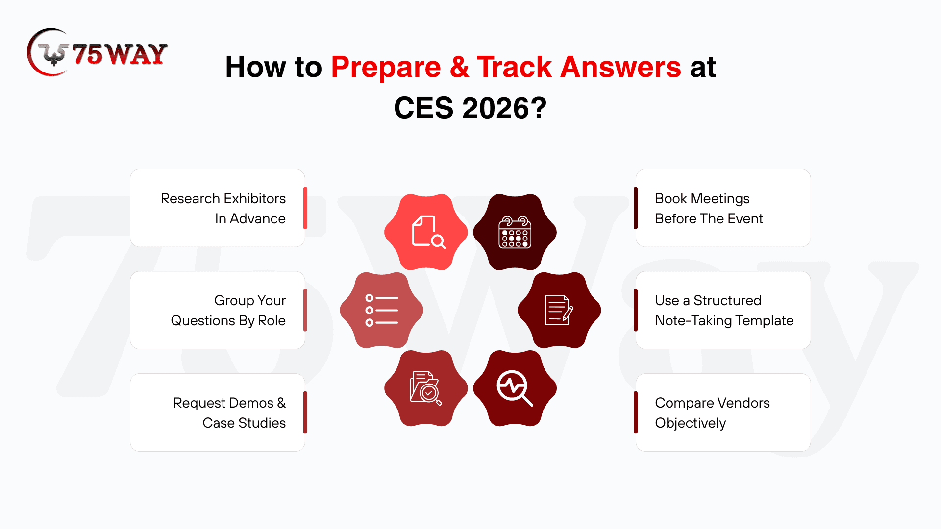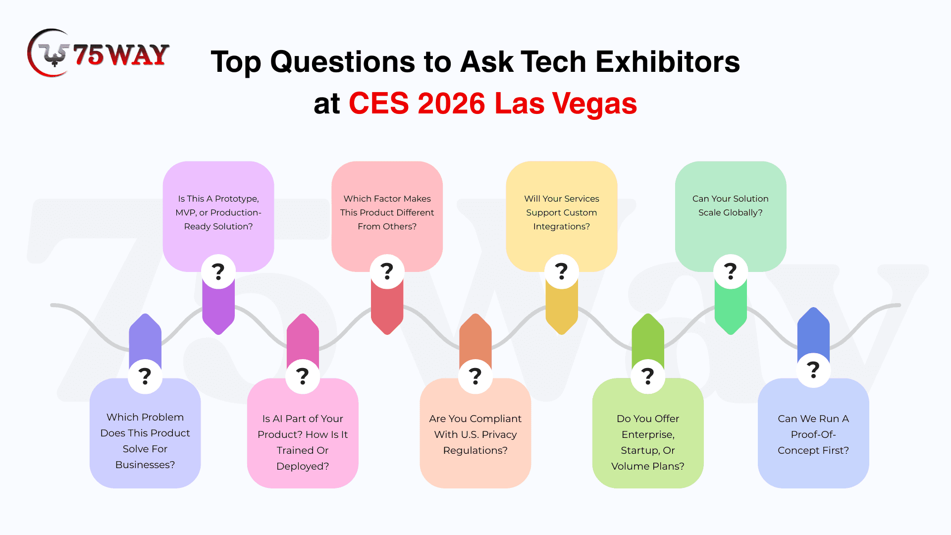 CES 2026 offers unparalleled access to innovations, connections, and insights from leading technology companies. Attendees who prepare thoughtfully and organize their questions carefully gain the most value. The right approach allows identification of partners, technologies, and opportunities that align with long-term goals. Whether you’re a buyer, investor, founder, analyst, or tech enthusiast, structured conversations help you separate signal from noise and build relationships that continue long after the show lights dim in Las Vegas. To resolve any queries related to AI, IoT, and advanced technology solutions, you can connect with 75way at North Hall, Booth 8700, for personalized guidance.