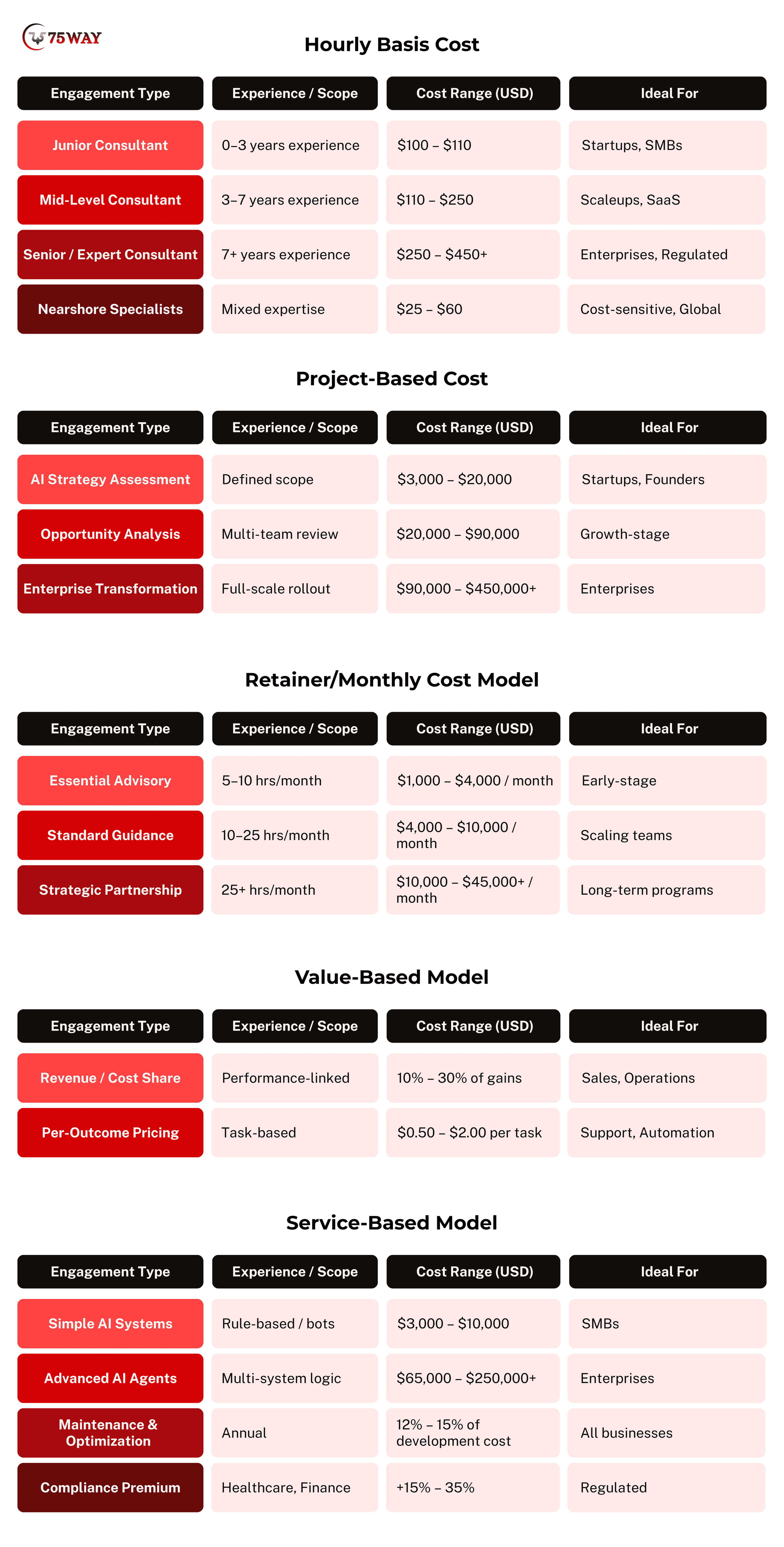 Every AI consulting company in USA has a different cost structure for its artificial intelligence consultancy services. The cost for AI consultancy varies based on expertise, engagement model, and project complexity. A deep understanding of pricing structures helps businesses plan budgets realistically, avoid unexpected expenses, and choose AI consulting companies that align with both short-term goals and long-term growth expectations. Here, we provide a complete breakdown of AI consulting costs.