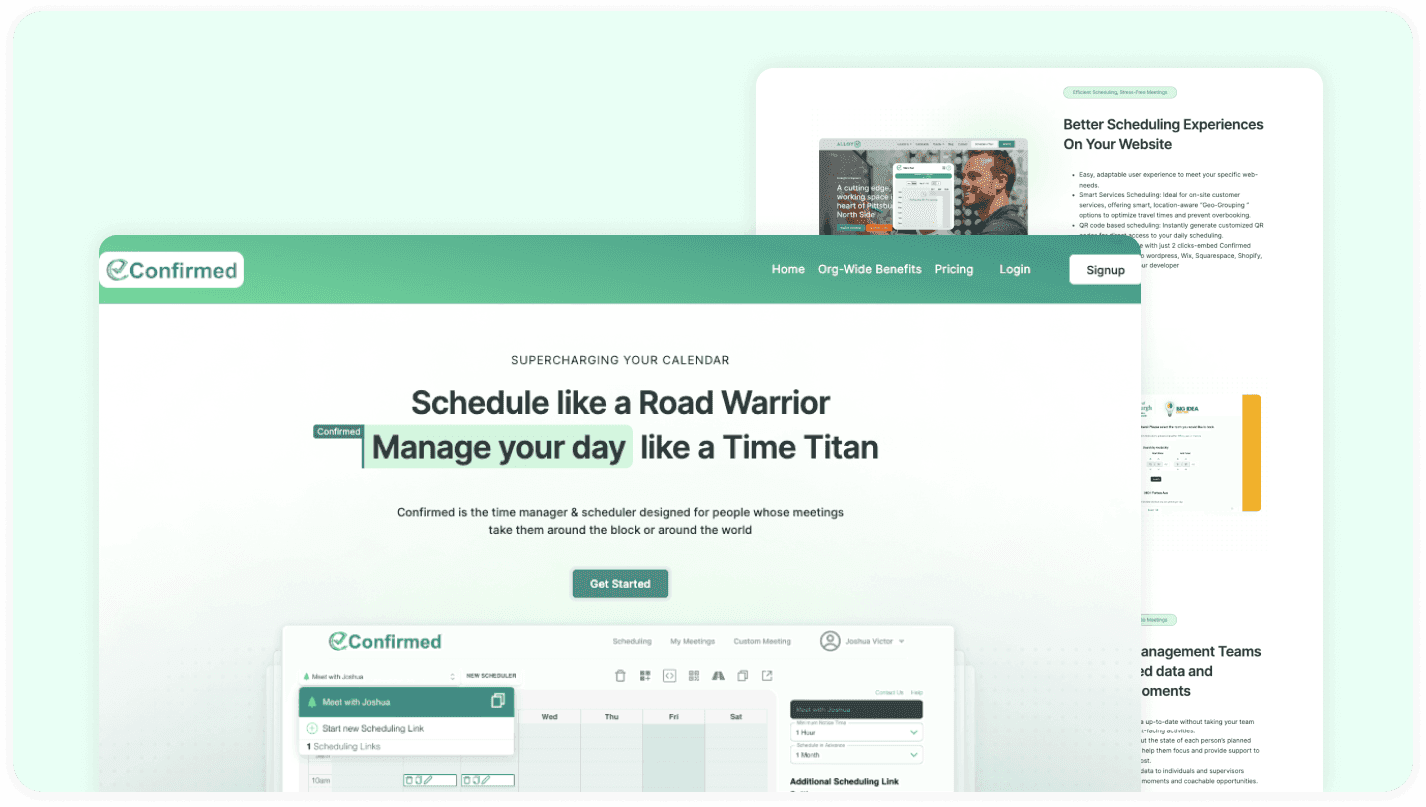Confirmed is an AI-powered web app designed to streamline meeting scheduling and optimize time management for professionals and teams. We integrate Microsoft Outlook and Google Calendar & Contacts to suggest meeting times and reduce time wastage. The platform also reduces travel time with Geo-Grouping™, improves CRM data accuracy, and enhances team collaboration. It helps businesses boost productivity, simplify workflows, and provide a seamless scheduling experience.