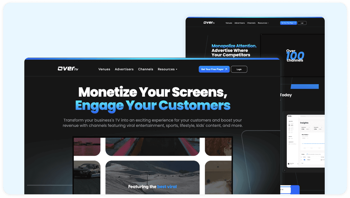 We created an OTT advertising platform that helps venue owners manage screen content while unlocking new revenue opportunities. Our team developed a platform that allows the admin to control videos, ads, and insights from a single dashboard. The platform connects effortlessly with the venue holder’s mobile app, enabling quick content activation and real-time updates on their screens. This solution delivers a smooth, modern experience that enhances engagement.